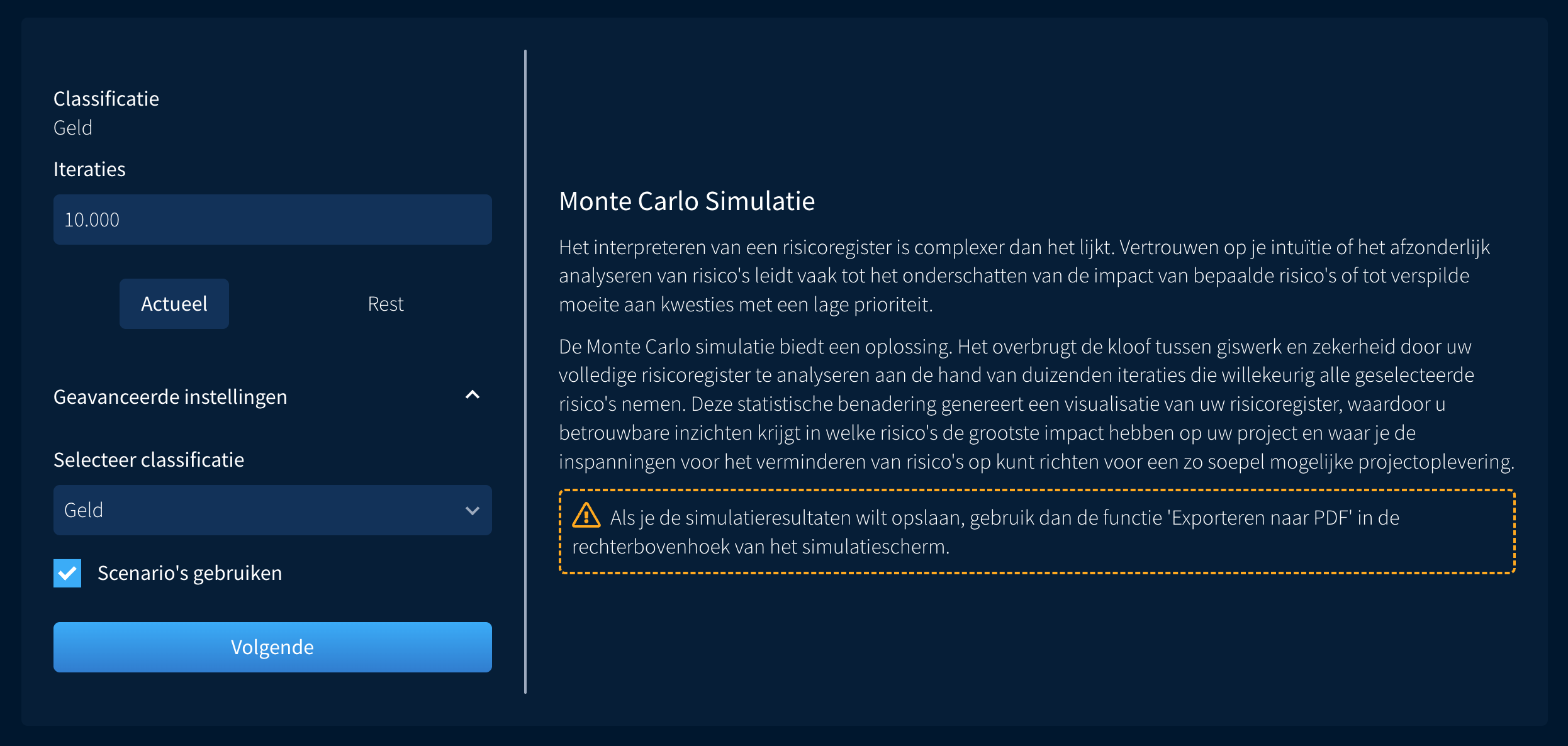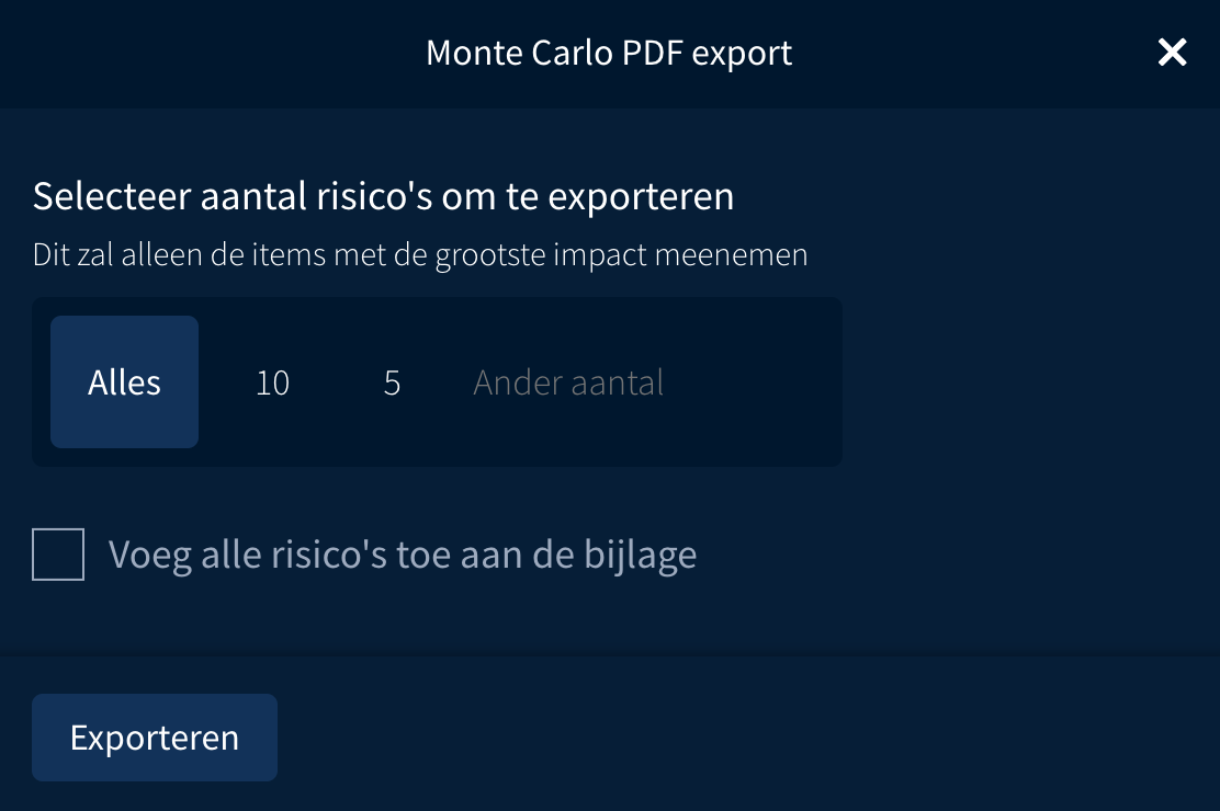 Je kunt de simulatieresultaten direct vanuit RiskChallenger exporteren als PDF. Daarbij zijn er een aantal opties waar je uit kunt kiezen: