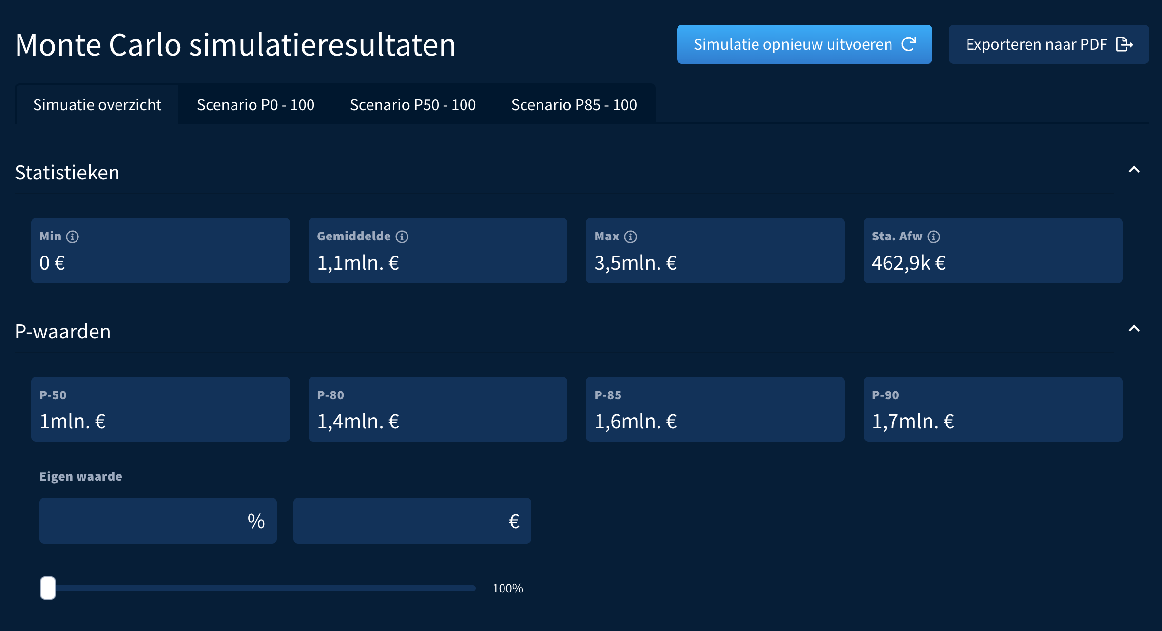 Bovenaan de resultatenpagina vind je een overzicht met verschillende statistieken en P-waarden. Als je een specifieke P-waarde wilt bekijken, kun je deze invoeren in het tekstveld om een op maat gemaakt resultaat te krijgen. Wanneer je met scenario’s werkt, kun je in hetzelfde overzicht gemakkelijk tussen scenario’s wisselen.