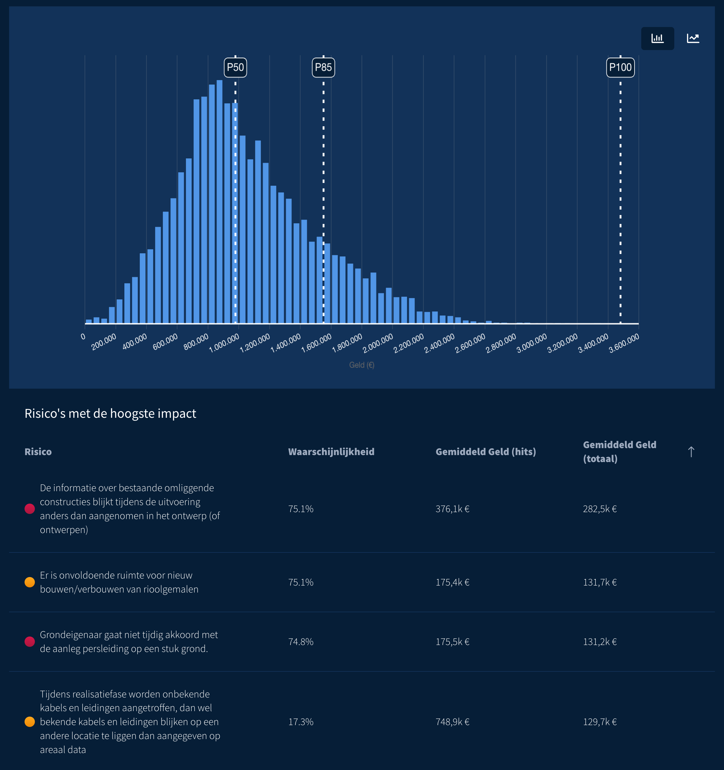 Monte Carlo-simulaties stellen gebruikers in staat om verder te kijken dan statische risicoscores en te onderzoeken hoe onzekerheid zich écht gedraagt binnen een project. Door een simulatie uit te voeren, krijg je inzichten die helpen bij beter onderbouwde en zelfverzekerde besluitvorming.